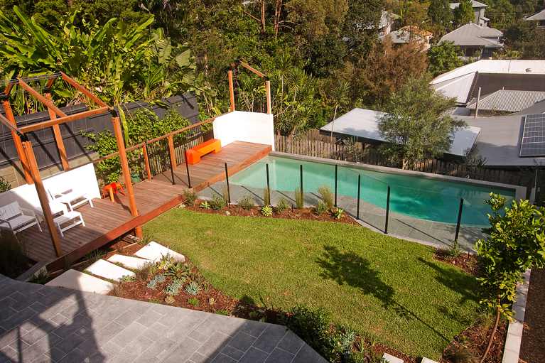 A modern twist on a freeform pool, the curved portion of the pool on the house side creates an inviting entrance and softens the harsh geometric feel. The design was brought about to incorporate a contemporary but relaxed feel to the sloping backyard. Multiple levels of decking create flow and warmth with contrast to the dark grey granite tiling.