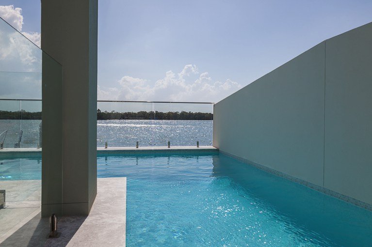 This stunning fully tiled pool wraps around the house’s entertaining area, and with its crisp, neutral tones, produces that private island feeling that overlooks the canals.