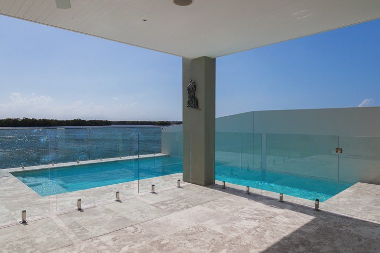 This exquisite pool wraps around and through the house, creating water features wherever you look. A glass bridge and walkway at the entry to the house, and a lap pool and overflow ponds at the rear of the property looking over the waterfront. This pool is in a class of its own.